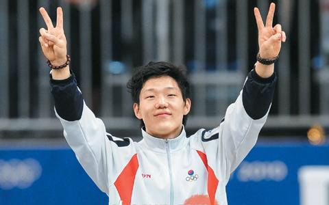 | ▲ 17일 밴쿠버올림픽 남자 스피드스케이팅 1000m에서 은메달을 딴 모태범이‘두 번째 메달’이라는 뜻으로‘V’자 사인을 그리고 있다. © 인터넷서울일보 |