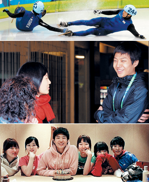 | ▲ 14일 밴쿠버올림픽 쇼트트랙 남자 1500m 결승에서 성시백(맨위 사진 오른쪽)은 이호석에게 밀려 넘어져 아깝게 은메달을 놓쳤다. 그래도 그는 이튿날 경기장에 찾아와 위로하는 어머니(가운데 사진 왼쪽) 앞에서 밝게 웃었고, 오히려 어머니를 위로했다. 18일 선수촌에서 열린 생일파티 때는 환한 미소를 띤 채 동료들과‘얼굴에 케이크 크림 바르기’같은 장난을 쳤다(/이은별 선수 미니 홈피). |
