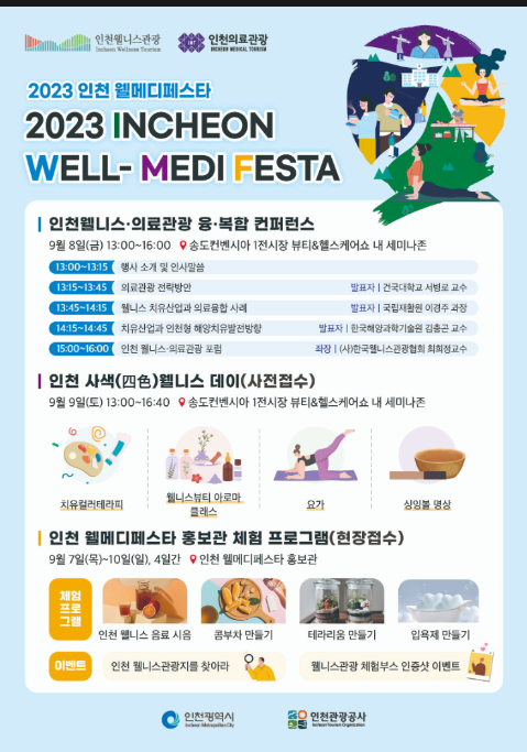 <2023 인천 웰메디 페스타>는 문화체육관광부 공모사업인 인천 웰니스·의료관광 융복합 클러스터 사업의 대표 행사로 올해 처음 개최되는데, 인천의 웰니스관광지와 의료기관을 체험할 수 있는 특별 전시 및 이벤트, 컨퍼런스 등의 다양한 행사로 구성되어 있다.