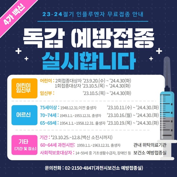 한편, 인플루엔자 예방접종과 관련한 자세한 사항은 과천시보건소(02-2150-3847)로 문의하면 된다.