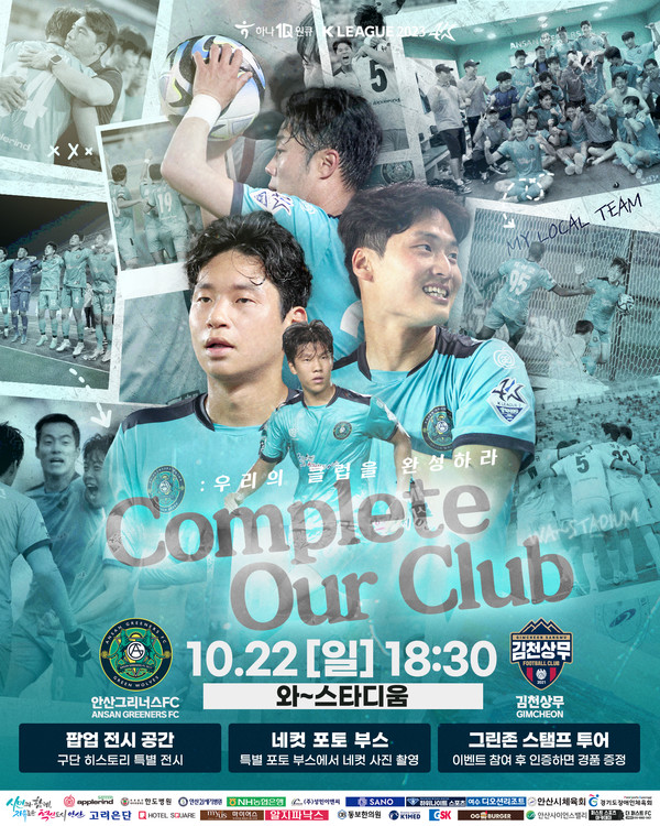 안산그리너스FC(이하 안산)는 22일(일) 안산 와~스타디움에서 김천상무(이하 김천)와 하나원큐 K리그2 2023 36라운드 홈경기를 치른다. 안산은 와텔러스가 기획한 “Complete Our Club: 우리의 클럽을 완성하라”라는 슬로건 하에 다양한 이벤트를 진행한다.