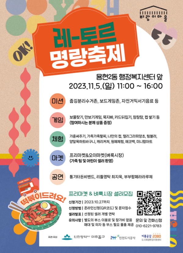 [ 경인신문= 이광일 기자] 인천도시공사(iH)는 용현2동 행정복지센터에서‘레-토르 명랑축제’를 오는 11월 5일 개최한다고 밝혔다.