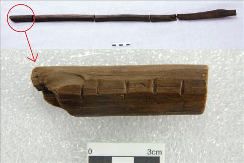 함께 발굴된 자(尺)추정 유물은 나무를 단면 6각형(지름 2㎝ 남짓)에 가깝게 깎은 것으로, 그 한쪽 면에는 1.1∼1.2㎝가량 되는 일정한 간격으로 눈금이 나 있다.
