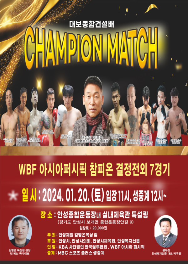 [ 경인신문= 박우열 기자] 안성제일 김명곤 복싱 짐이 주최하고 안성시의회와 안성시체육회, 안성복지신문이 후원하는 대보종합건설(주)(회장박봉열)배 WBF아시아-퍼시픽 참피온 결정전 외 7경기가 안성에서 개최된다.