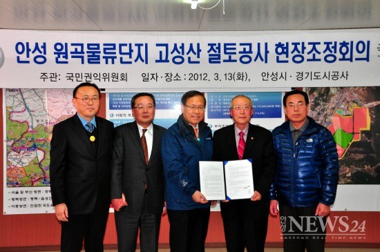 원곡면 칠곡리 일원 67만9천711㎡에 2천46억원을 들여 물류단지를 조성 중인 물류단지는 그러나 지난 1월 경주이씨 종중 측이 사업부지 인근 경계인 고성산 훼손과 잘린 땅에 대한 축대벽 설치 등을 요구하며 국민권익위에 진정서 등 집단 민원을 제기해 사업 추진에 어려움을 겪어 왔다.
