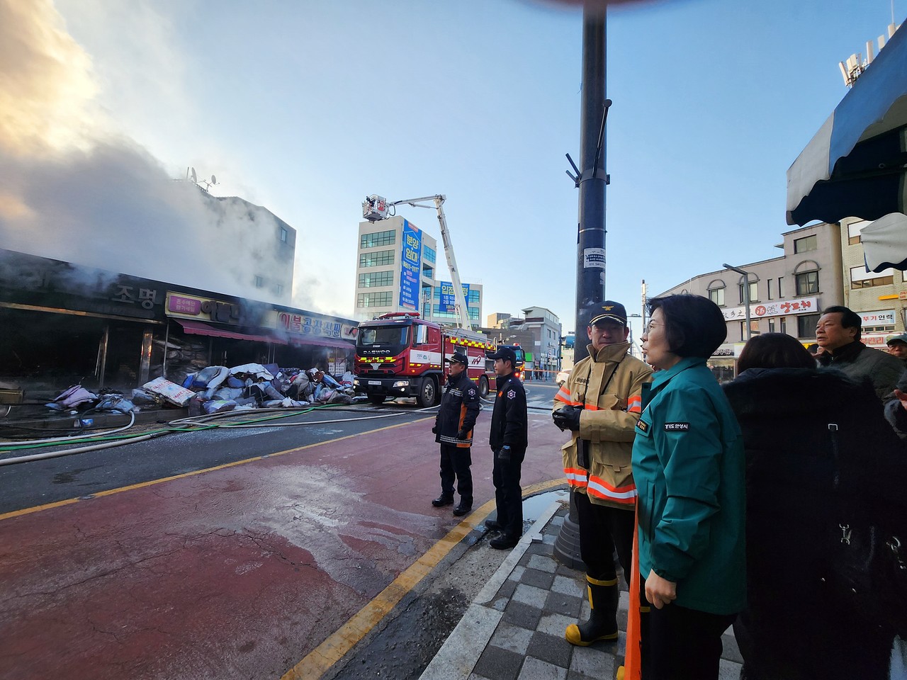 현장 인근을 지나던 김보라 시장도 화재 소식을 접하고 급히 현장에 도착해 상황을 살폈으며, 영하 15도의 추운 날씨에 진화 작업에 애쓰는 소방관들을 격려했다.