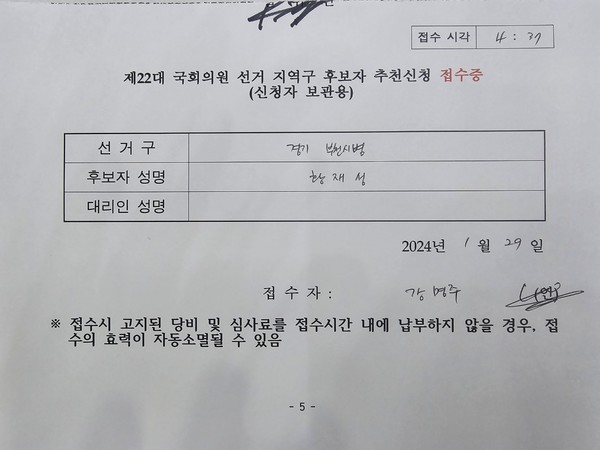 오를 부천시 병선거구 제22대 국회의원 선거 황재성후보 중앙당 공천 심사 등록을했다