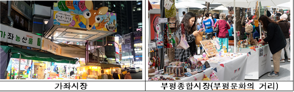 ‘부평종합시장’은 1958년 부평서초등학교 자리에 노점 형태로 생겨난 부평공설시장을 시작으로 1970년대 현재의 위치로 이전한 부평에서 가장 오래된 시장이다. 닭강정, 중국풍 꽈배기가 유명하며, 젊은이들의 핫플레이스 ‘부평 문화의 거리’와 카페・맛집이 즐비한 ‘평리단길’과 이어져 있어 시간여행을 하는 듯 이색적인 경험을 할 수 있다.