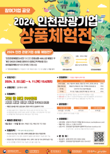 [경인신문= 이광일 기자] 인천시(시장 유정복)와 인천관광공사(사장 백현)는 인천 관광기업의 판로 확대를 위한‘2024 인천 관광기업 상품 체험전(이하, 체험전)’의 참여기업 공모를 3월 22일부터 4월 11일까지 진행한다고 밝혔다.