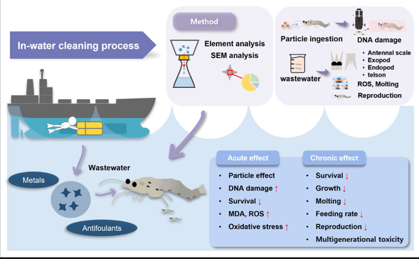 연구팀은 수중 청소로봇이 선박선체 청소하는 중 발생하는 배출물 대상 다양한 해양생물들에 대한 영향평가를 실시했으며, 배출물 내 선체 생물 부착 방지를 위해 사용된 방오도료가 비표적 생물들에게 큰 독성을 일으키는 사실을 발견했다.
