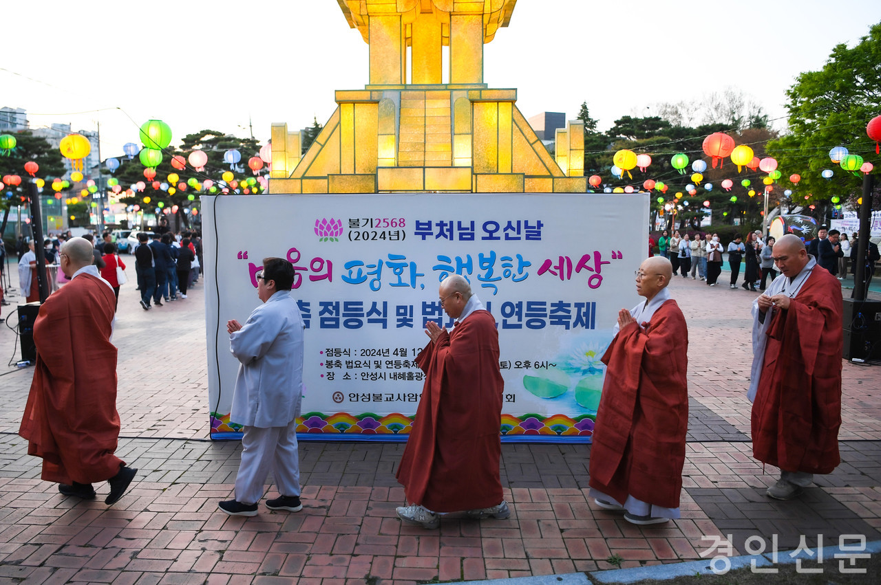 [ 경인신문= 박우열 기자] 안성불교사암연합회(회장 칠장사 주지 지강)가 지난 12일 오후 6시 2568년 부처님 오신 날을 앞두고 내혜홀 광장에서 봉축탑 점등식을 봉행했다.