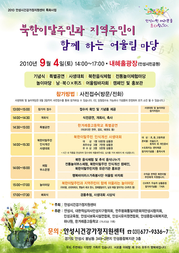 안성시 건강가정지원센터는 오는 9월 4일 내혜홀 광장에서 ‘북한이탈주민과 지역주민이 함께하는 어울림마당’을 개최한다고 밝혔다.