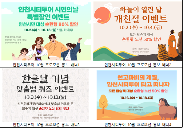 제59회 시민의 날을 맞아 시민행복주간 시민혜택으로 10월 2일부터 10월 13일동안 인천 시민을 대상으로 순환형 노선을 80% 할인하며, 10월 2일부터 10월4일에는 개천절 맞이 ‘하늘이 열린 날, 개천절’이벤트를 개최하여 모든 탑승객 대상 순환형 노선을 50% 할인한다.