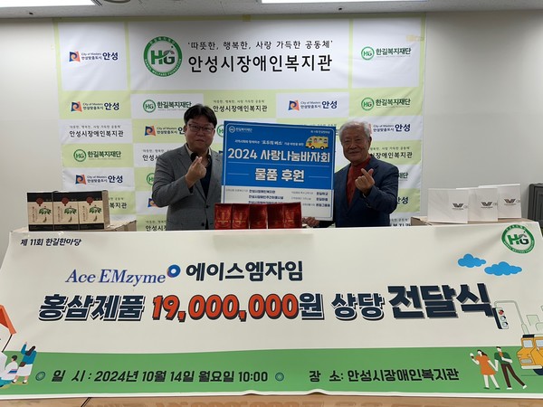 또, 10월 15일 안성시장애인복지관에서 열린 전달식에서 에이스엠자임은 홍삼제품 3종(홍삼스틱 30포 실속형, 홍삼정 240g, K-이뮨밸런스 15ml x 3병)을 각각 100개씩, 총 300개의 제품을 기부했다.