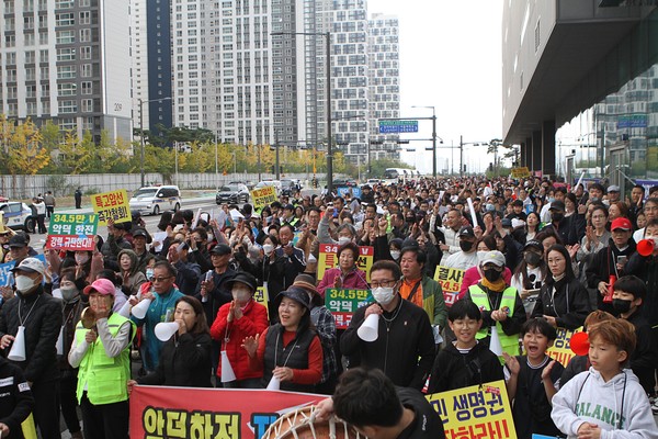 11월 3일 일요일 오후 5시 3,000여 명의 배곧 주민들은 서울대학교 교육동 앞에서 특고압선 매립에 대한 결사반대 집회를 열었다.