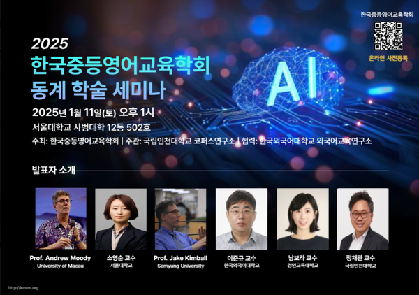 [경인신문= 이광일 기자] 국립인천대(총장 박종태) 코퍼스연구소는 한국중등영어교육학회(회장 정채관)와 함께 오는 2025년 1월 11일(토), 서울대 사범대학에서 동계 학술세미나를 개최한다.