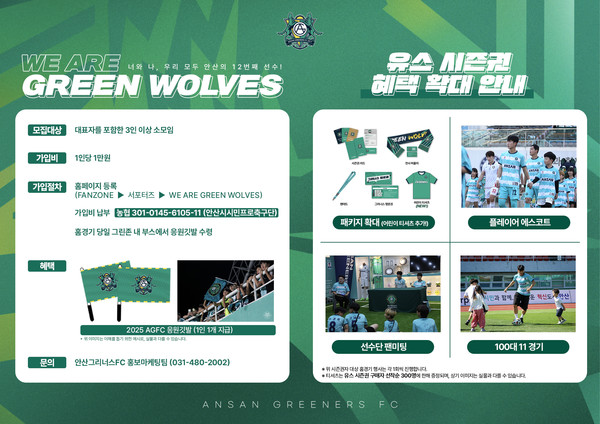 또한, 안산그리너스FC는 2025 유스 시즌권 혜택을 강화했다. 유스 시즌권자 대상으로 에스코트키즈, 팬미팅, 어린이 축구교실 각 1회 참여권을 부여하며, 선착순 구매자 300명에게는 기존 패키지에 어린이용 티셔츠를 추가로 제공한다.