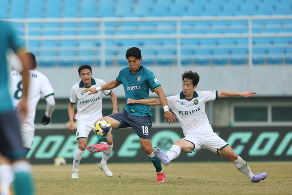 안산은 전반 초반 김포의 공세에도 쉽게 무너지지 않았다. 김민식과 브루노, 루이스가 안산의 골문을 여러 차례 위협했으나, 수비진이 높은 집중력을 유지해 상대 공격을 틀어막았다.