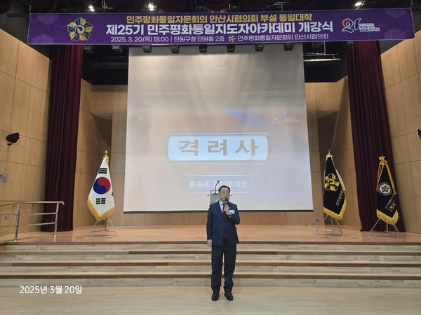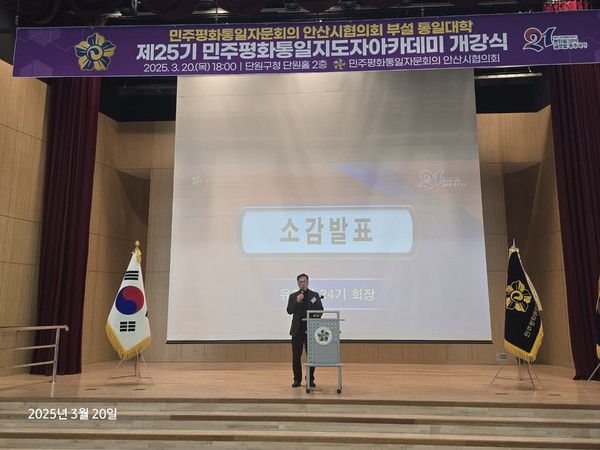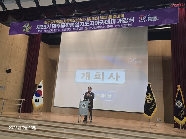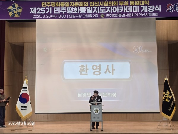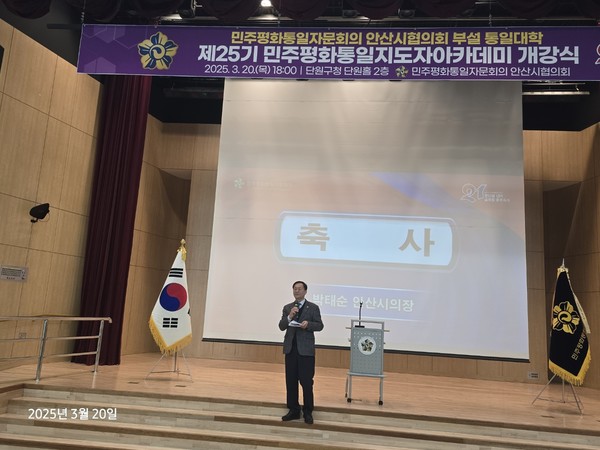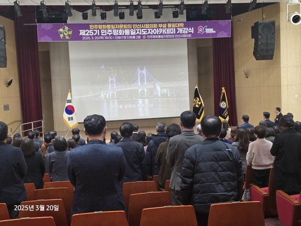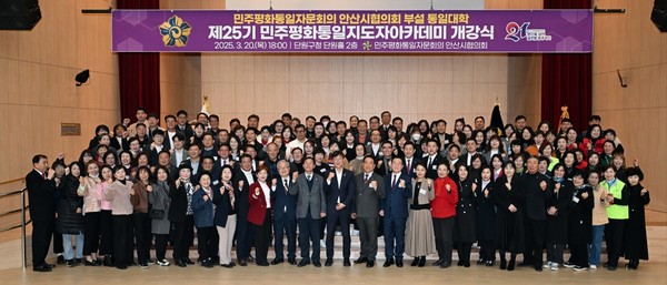 [ 경인신문= 김현수 기자] 민주평화통일자문회의 안산시협의회(협의회장 김기백)는 3월 20일(목) 안산시 단원구청 단원홀에서 민주평통 홍승표 경기부의장, 이민근 안산시장, 박태순 안산시의장을 비롯해 민주평통 안산시협의회 자문위원, 안산시민, 북한이탈주민, 다문화 이주민등 200여명의 수강생이 참석한 가운데 통일대학 제25기 민주평화통일지도자아카데미 개강식을 개최했다.