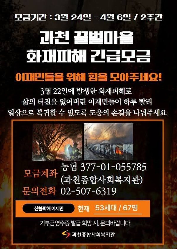 지난해에는 폭설로 비닐하우스가 붕괴되어 2명의 이재민이 발생했고, 2022년에는 집중호우로 16명의 주민이 과천시 '꿀벌마을'에서 지난 22일 발생한 대형화재로 50여 가구, 60여 명의 주민들이 삶의 터전을 잃었다.