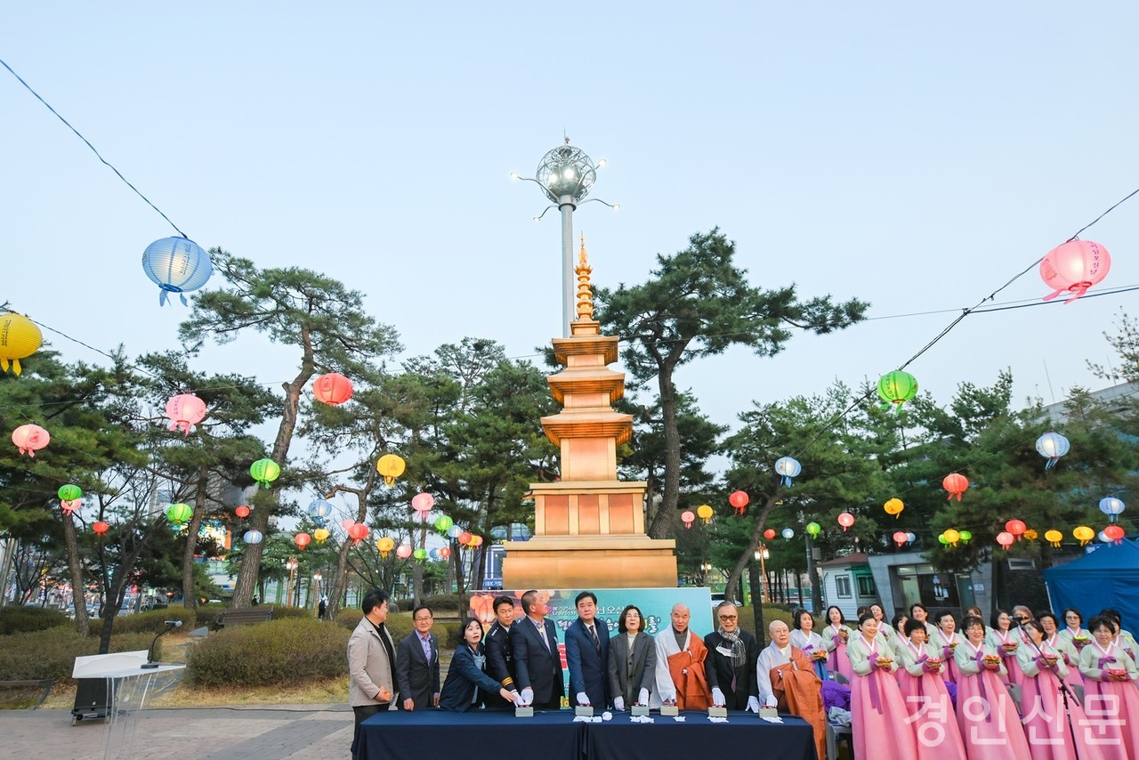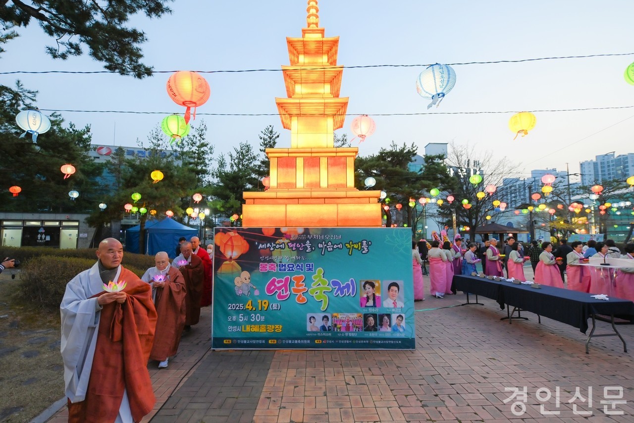 [경인신문= 박우열 기자] 안성불교사암연합회(회장 칠장사 회주 지강)가 지난 4일, 불기 2569년 부처님오신날을 앞두고 석정동 내혜홀 광장에서 '세상에 평안을, 마음에 자비를(Peaceful World, Compassionate Mind)'이란 주제로 봉축탑 점등식을 봉행했다.