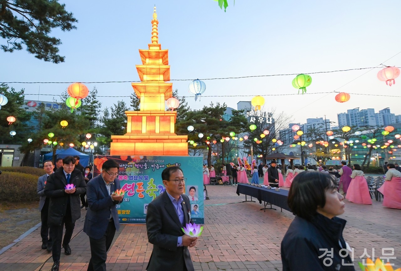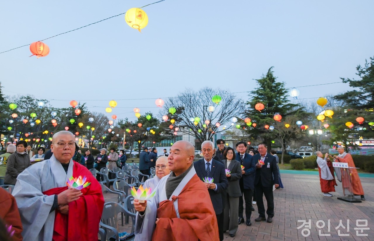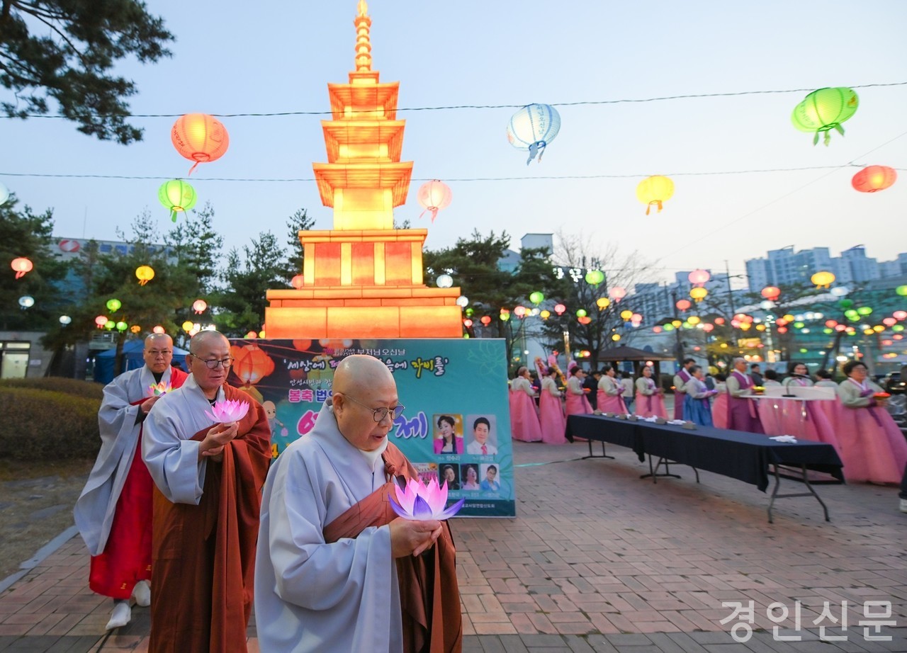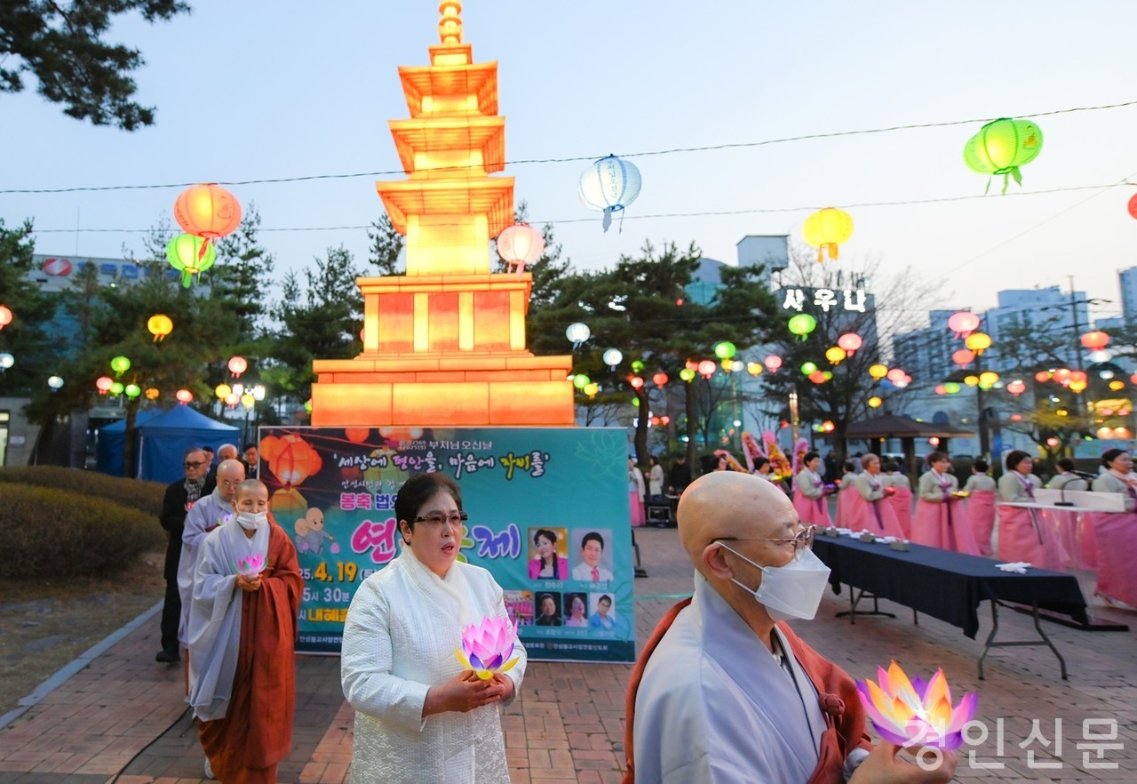 마지막으로 이날 함께 자리한 스님들과 기관사회 단체장, 그리고 시민들은 연합회에서 준비한 연꽃 등을 들고 두 손을 모아 탑돌이를 하며 가정의 안녕과 행복을 기원했다.