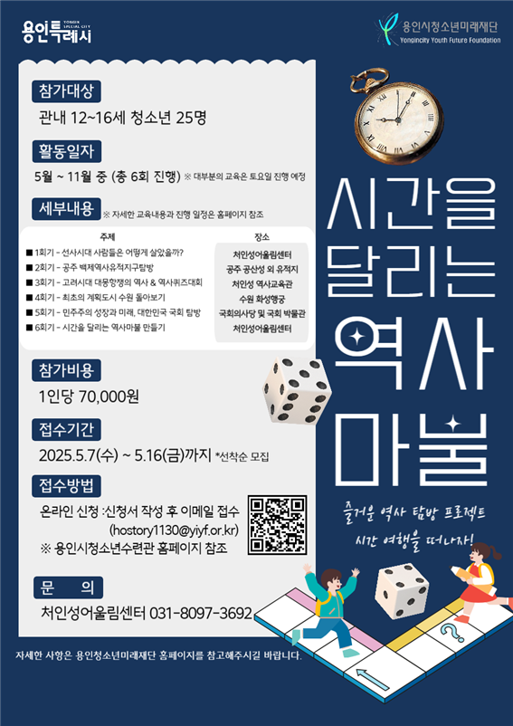 모집 대상은 용인시에 거주하는 12세부터 16세까지의 청소년이며, 총 25명을 선착순 모집한다. 참가비는 7만 원으로, 역사 체험 활동과 교육, 재료비 등이 모두 포함된다. 접수는 5월 7일 오전 9시부터 온라인으로 진행되며, 자세한 내용은 용인시청소년미래재단 홈페이지 또는 포스터에 기재된 QR코드를 통해 확인할 수 있다.