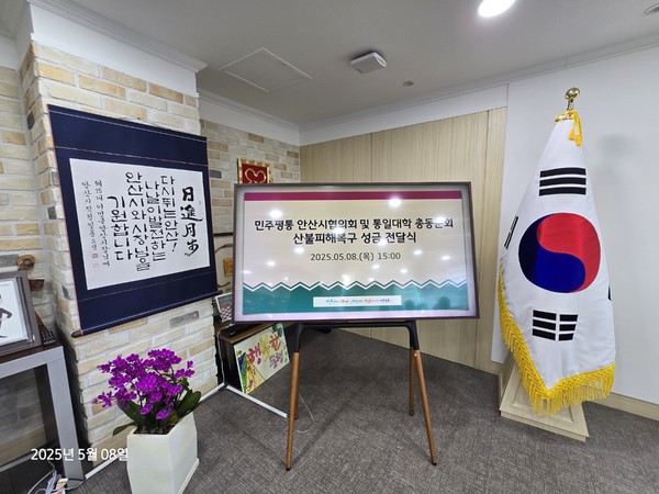 민주평화통일자문회의 안산시협의회와 부설 통일 대학 총동문회 가 '영남지역 산불 피해자들을 위한 특별모금 전달식'을 진행하며 산불 피해 주민들을 돕는 십시일반 따뜻한 손길을 전했다.