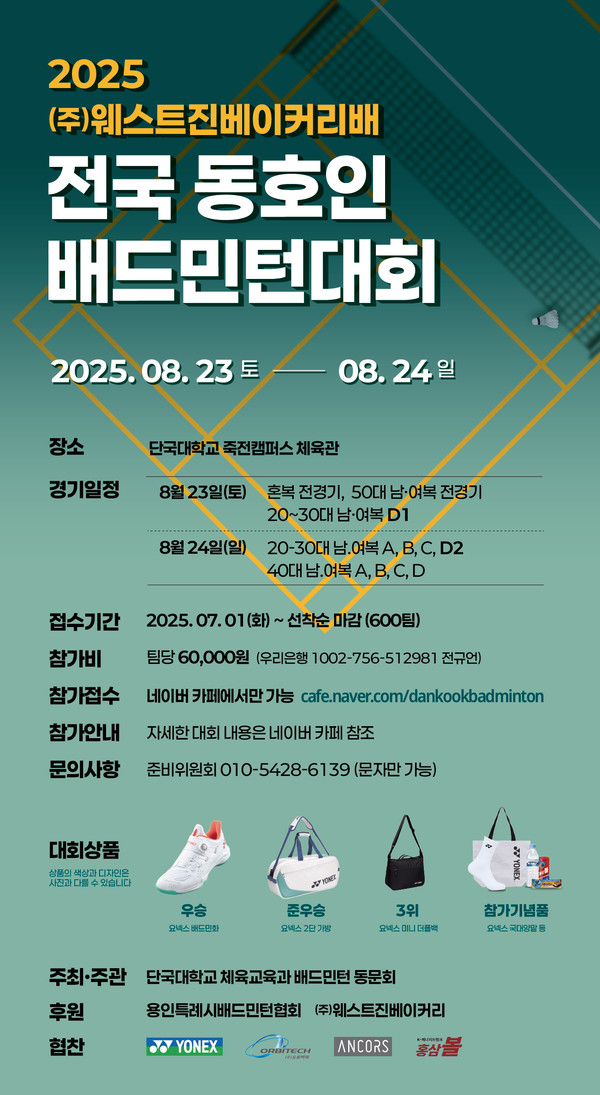 단국대학교 체육교육과 배드민턴 동문회(회장 제창욱)는 오는 8월 23일(토)부터 24일(일)까지 이틀간 죽전캠퍼스 체육관에서 ‘2025 ㈜웨스트진베이커리배 단국대학교 전국 동호인 배드민턴대회’를 개최한다고 밝혔다.