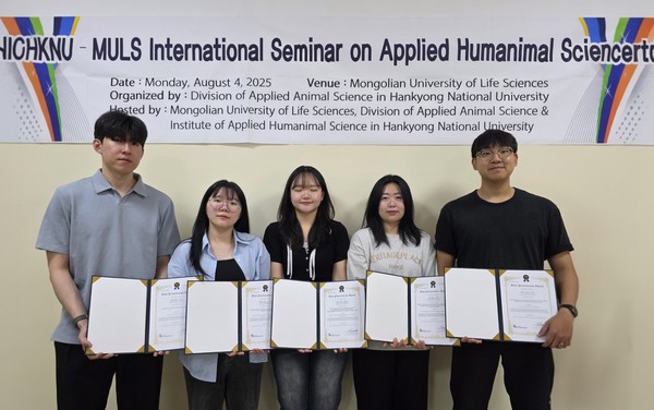 [경인신문=정혜윤 기자]한경국립대학교(총장 이원희)는 국립몽골생명과학대학교에서 열린 ‘한경국립대-몽골생명대 휴머니멀 응용과학 국제세미나’에서 우수발표상을 수상했다고 6일 밝혔다.