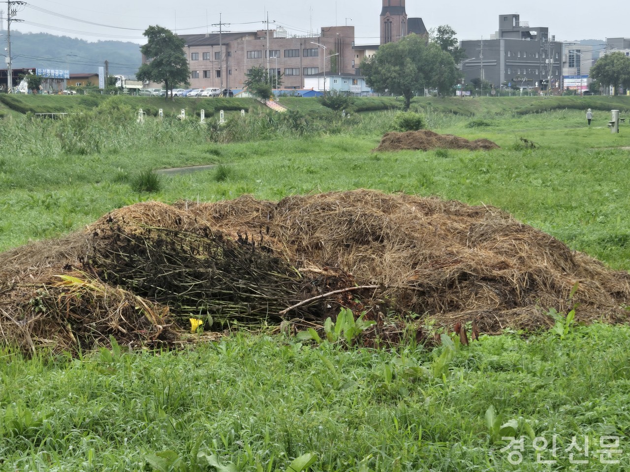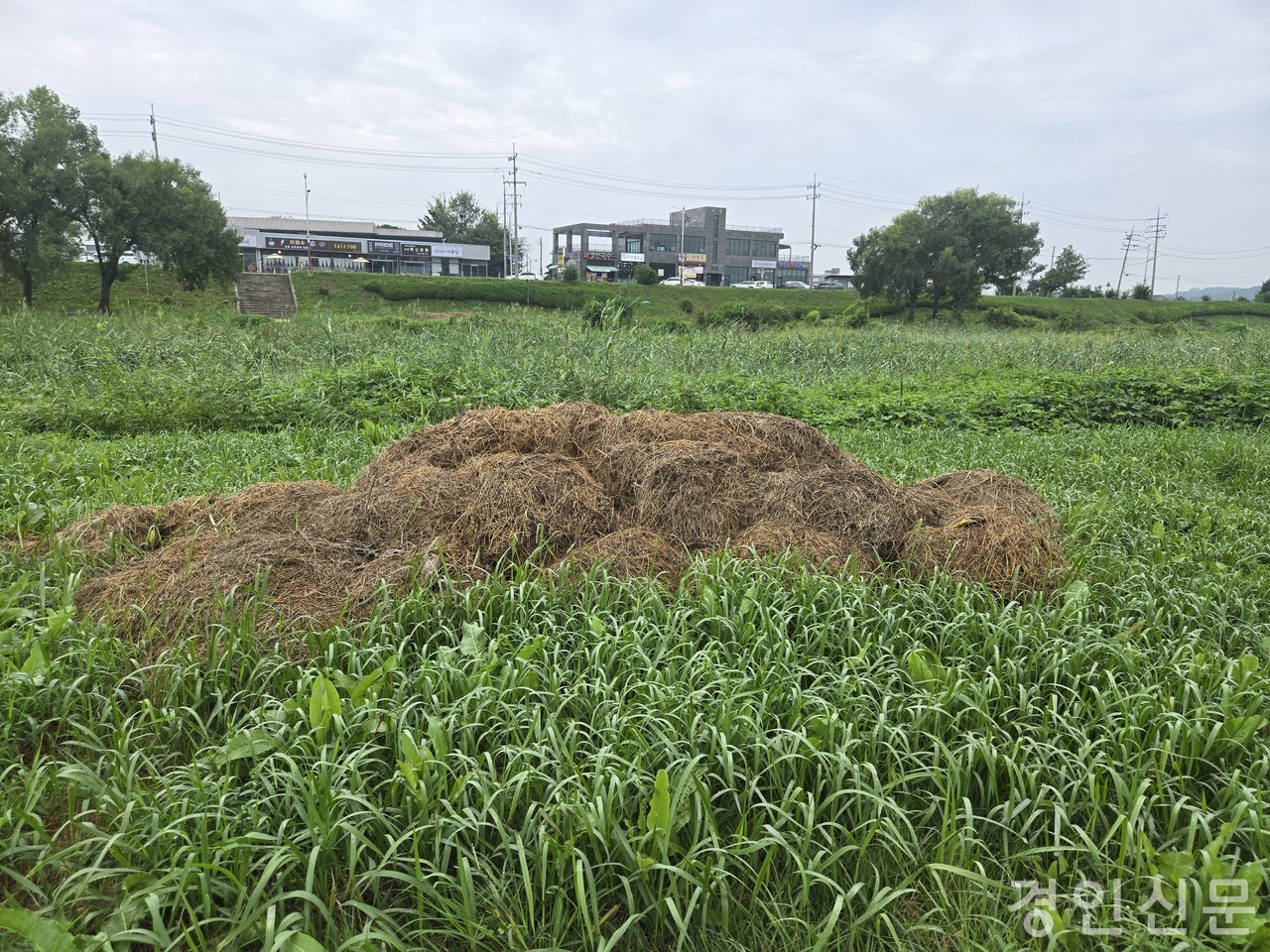 지난 5일과 8일 제보자들의 말에 따르면, 안성시는 최근 안성천 산책로 인근에서 제초작업을 진행한 뒤 발생한 풀더미를 수거하지 않고 쌓아둔 채 방치했다.