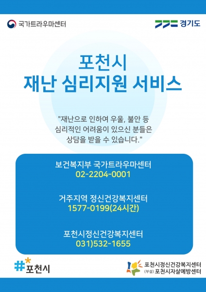 포천시정신건강복지센터는 재난심리지원사업의 원활한 추진을 위해 3년 전부터 전 직원이 심리적 응급처치 교육을 이수하고 취약계층 및 문제유형별 대응지침 교육을 실시해왔다.