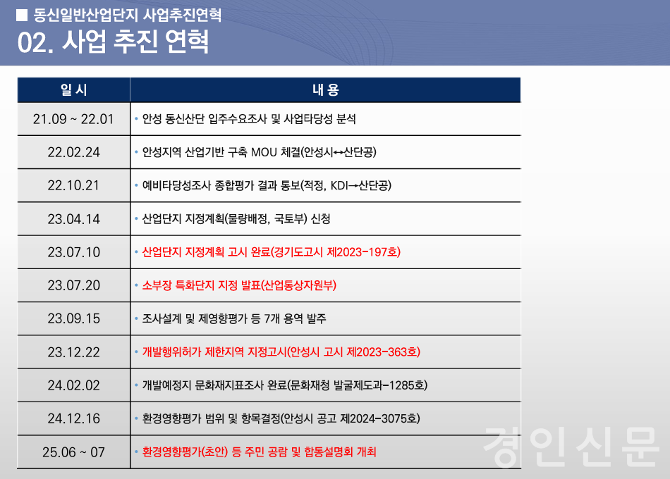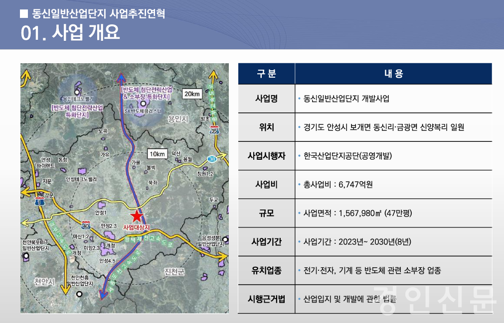 한편, 동신일반산업단지는 경기도 안성시 보개면·금광면 일원 약 157만㎡ 규모로 조성되며, 반도체 장비·소재·부품 특화 클러스터를 목표로 한다. 이 사업은 2023년 경기도 산업단지 지정계획에 반영됐으며, 2027년 착공, 2030년 준공을 목표로 추진되고 있다. 특히 국도 38호선과 세종-포천 고속도로 등을 통해 평택·이천·용인 반도체 벨트와 연계할 수 있는 전략적 장점을 보유하고 있다는 평가다.