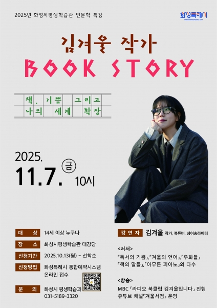 강연을 맡은 김겨울 작가는 ‘책의 말들’, ‘겨울의 언어’, ‘독서의 기쁨’ 등의 저서를 통해 독자들과 소통해왔으며 유튜브와 라디오 등 다양한 매체를 통해 대중성과 전문성을 겸비한 콘텐츠를 꾸준히 선보여 왔다.