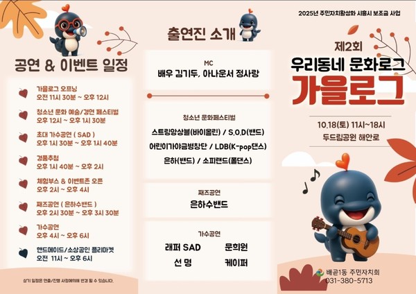 김영복 배곧1동장은 “주민이 중심이 되는 문화 향유의 장으로 성장하고 있다”며 “이번 행사를 계기로 지역공동체의 화합과 문화적 자긍심이 더욱 확산되길 기대한다”고 전했다.
