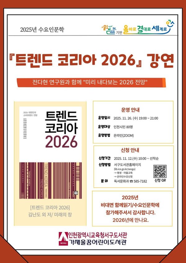 이번 강연은 서구도서관의 대표 인문학 프로그램인 ‘수요인문학’의 일환으로 함께읽기 프로그램과 연계해 온라인으로 운영된다.