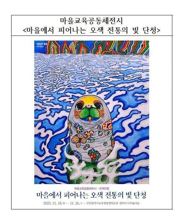 ▲ 인천광역시교육청평생학습관 11월 전시 마을에서 피어나는 오색 전통의 빛 단청 실시 [경인신문-이광일 기자] 인천광역시교육청평생학습관은 11월 18일부터 26일까지 평생학습관 2층 갤러리 나무와 다솜에서 ‘마을에서 피어나는 오색 전통의 빛 단청’전시를 개최한다.전시에서는 전통 미술 문화인 ‘단청’을 현대적 감각으로 재해석한 다양한 작품이 선보이며 책갈피·단청스탬프 만들기 등 체험 프로그램도 마련된다.관람 시간은 오전 10시부터 오후 6시까지이며 일요일과 공휴일은 휴관한다.