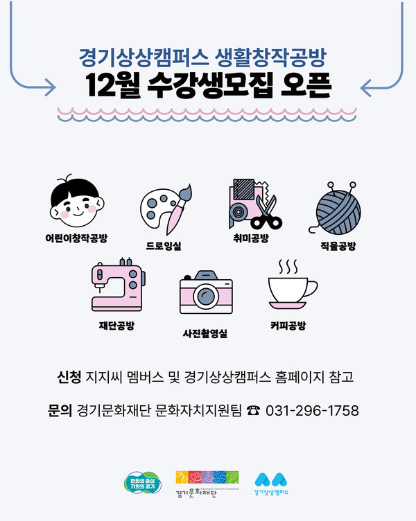 [ 경인신문= 이희찬 기자] 경기문화재단 경기상상캠퍼스(대표이사 유정주)는 겨울 시즌 생활창작공방 프로그램 참여자를 오는 17일부터 모집한다.