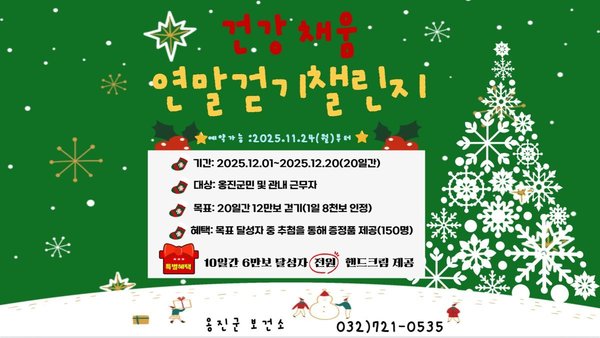 12월 걷기 챌린지와 관련해 자세한 사항은 옹진군보건소 건강증진과로 문의하면 된다.