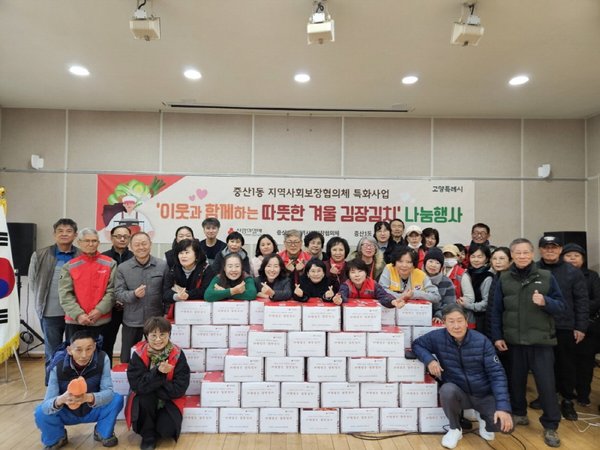 이번 행사는 중산1동 마을축제‘으랏차차 중산1동’에서 모금된 기부금과 플리마켓 수익금 및 지역사회보장협의체·적십자봉사회·주민자치회·통장협의회 등 직능단체와 개인기부를 통해 마련됐으며, 사회복지공동모금회로 지정기탁해 김장김치 사업비로 사용됐다.