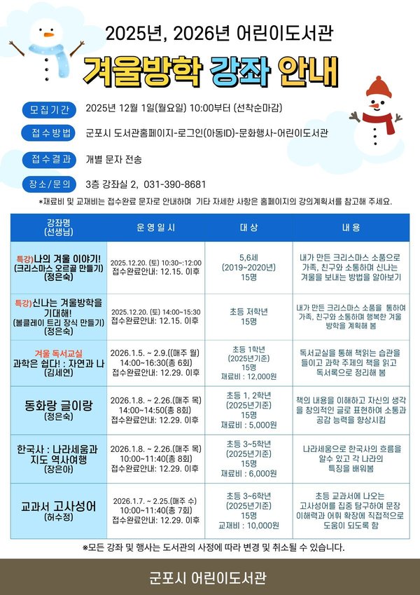 12월 20일 크리스마스 맞이 특강을 시작으로 겨울 독서교실과 여러 분야의 강좌가 마련돼 어린이들의 독서 습관 형성과 지식 탐구를 돕는다.