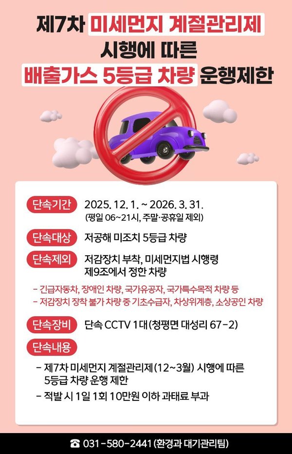 군 관계자는 “대기환경 개선과 주민 건강을 위해 5등급 차량 운행 제한 조치가 시행되는 점을 양해해 주기 바라며, 제7차 계절관리제에 군민들의 적극적인 관심과 참여를 부탁드린다”고 말했다.