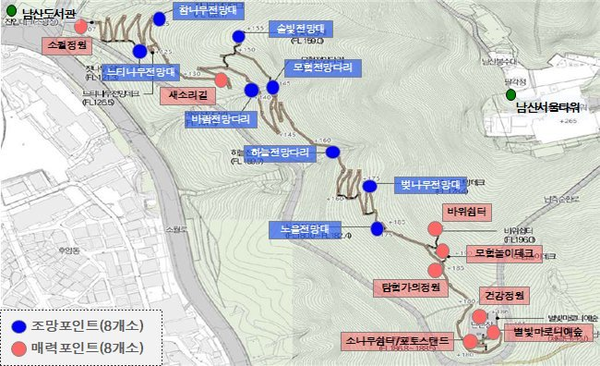 또한 남산의 자연을 효과적으로 활용해 8개의 조망포인트와 8개의 매력포인트를 조성했으며, 걷고 보고 쉬는 것은 물론 체험까지 한 번에 경험할 수 있다. 편리한 데크길을 걸어가며 도심의 다양함을 느낄 수 있는 전망대를 만날 수 있으며 아이들이 즐길 수 있는 모험전망다리도 갖춰져 있다. 남산의 우량 소나무 씨앗을 모아 키운 ‘남산 소나무 후계목’이 식재된 곳도 볼거리다. 주요 조망 포인트별로 특별한 사진을 찍을 수 있도록 하는 안내판이 설치되어 있다.