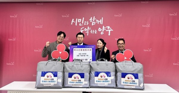 옥정2동이 25일 하나신협 김중열 이사장과 손재현 전무로부터 어려운 이웃들의 따뜻한 겨울나기를 돕기 위한 사회공헌사업의 일환으로 이불 4채와 현금 50만 원을 전달받았다