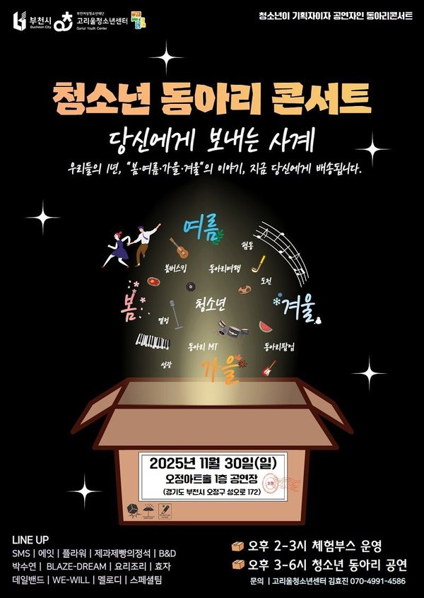 이번 콘서트는 청소년들의 일 년간 활동을 ‘봄·여름·가을·겨울’이라는 사계절 이야기로 담아낸 종합 공연으로, 각 동아리가 준비한 음악·댄스·밴드·퍼포먼스 등 다양한 장르의 무대가 펼쳐질 예정이다.