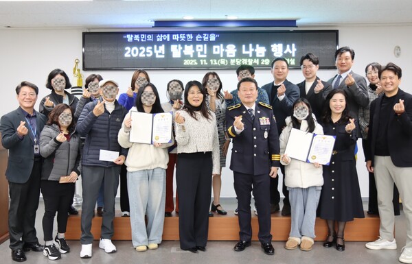 [경인신문= 최철호 기자]분당경찰서(서장 심한철)와 분당경찰서 안보자문협의회(회장 이혜임)는 연말을 맞이하여 13일 분당경찰서에서 북한이탈주민을 대상으로 장학금 수여 및 생활안정지원금 전달식을 개최했다.