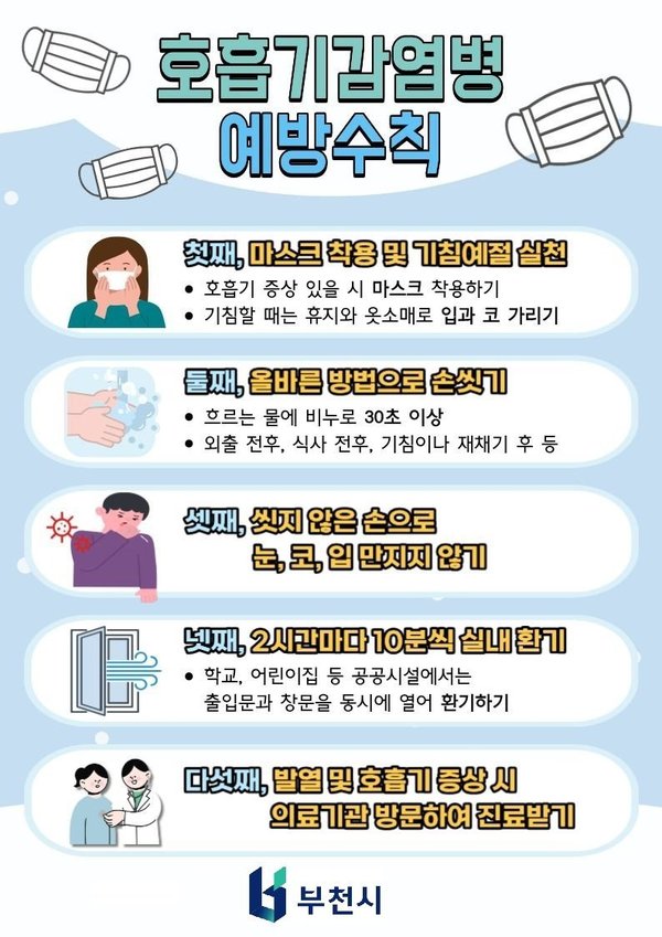 김은옥 부천시보건소장은 “겨울철에는 계절적 요인으로 각종 호흡기질환이 유행하기 때문에 일상에서 감염 예방수칙 준수가 중요하다”며 “특히 어르신과 어린이 등 고위험군은 호흡기 감염병에 감염될 경우 중증으로 진행될 우려가 있어 세심한 주의가 요구된다”고 말했다.