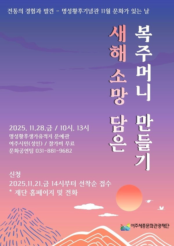 이순열 여주세종문화관광재단 이사장은 “2025년의 명성황후기념관은 10번의 문화가 있는 날을 통해 여주시민과 만나며 잊혀져가는 전통을 경험하고 발견하는 시간이 되었다.”라며 “이번 11월 문화가 있는 날을 함께하며 운수대통하는 새해를 준비하는 시간이 되기를 바라며 2026년에도 많은 참여를 바란다.”고 밝혔다.