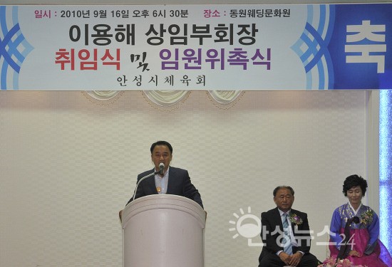 지난달 20일 안성시체육회 상임부회장 으로 선출된 이용해 (전 대덕면 체육회장)씨의 안성시체육회 상임 부회장 취임식이 16일 동원 웨딩홀 4층 연회장에서 있었다.