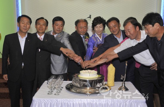 ▲취임식이 끝난후 축하 케이크를 자르고 있는 관계자들. 사진/박우열 기자 또한 이 자리에서는 오랜 기간 안성시체육회의 모든 사무를 총괄해 왔던 소상영 사무국장이 사임을 했으며 새로운 임원진들 의 위촉식도 병행되었다.